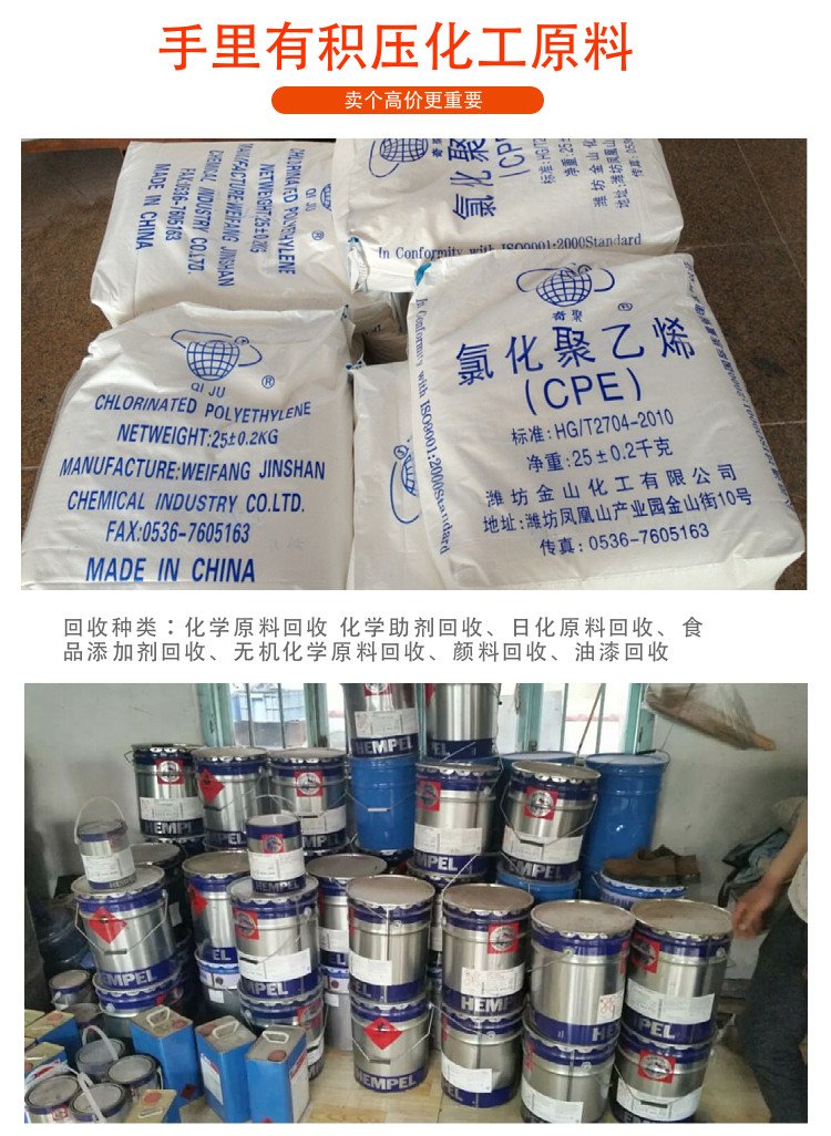 消光粉、聚乙烯蜡、塑胶颗粒、百合颜料、玫瑰香精、回收木糖醇、氯化橡胶漆、油溶性颜料、回收中间漆、聚氨酯白料、气相法白炭黑、金属络合染料、过期粗空硅胶、过期维生素e油、氟碳油漆固化剂