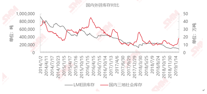 截止2月14日,LME锌库存连续数日下降至98000吨,刷新了 11年以来的新低。而国内库存,因春节假期等原因进入传统累库阶段,截止本周五,较节前已累计增长5.67万吨至18.70万吨。那么当前内外锌库存走向出现明显分歧,在国内累库,海外续降的背景下,对锌价又将有什么样的影响呢?
