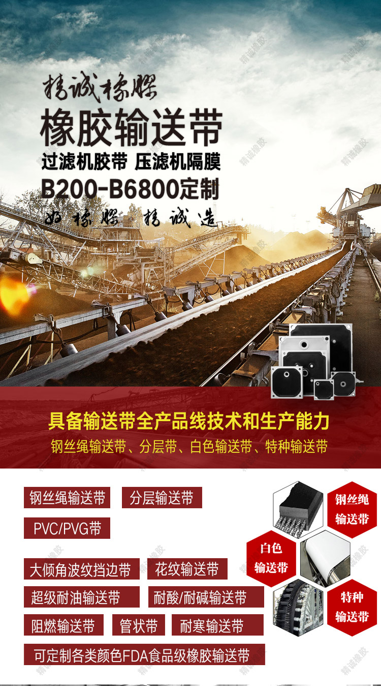 压滤机、橡胶衬板、半自磨机、滤机胶带、橡胶输送带、橡胶提升条、磨机橡胶压条、电子秤橡胶皮带、防滑花纹输送带、加强橡胶传送带