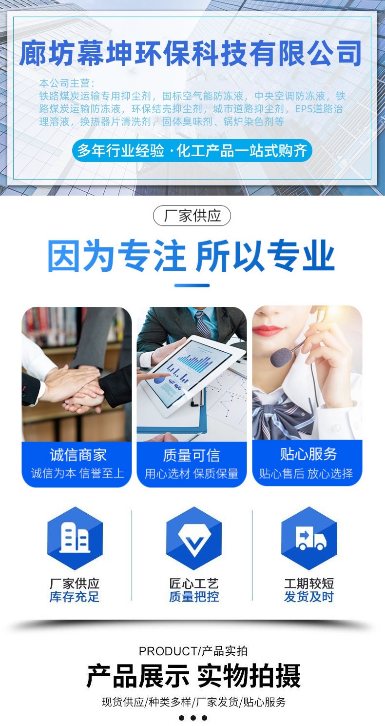 防冻液、臭味剂、地暖电锅炉、臭味变色剂、冷却乙二醇、锅炉冷却塔、防丢水药剂、道路抑尘剂、采暖水变色剂、采暖水防丢剂、锅炉防盗水剂、采暖炉变色剂、管道防丢水剂、铁路运输抑尘剂、超浓缩防丢水剂、煤炭运输抑尘剂、地暖专用载冷液、固体液体保水剂