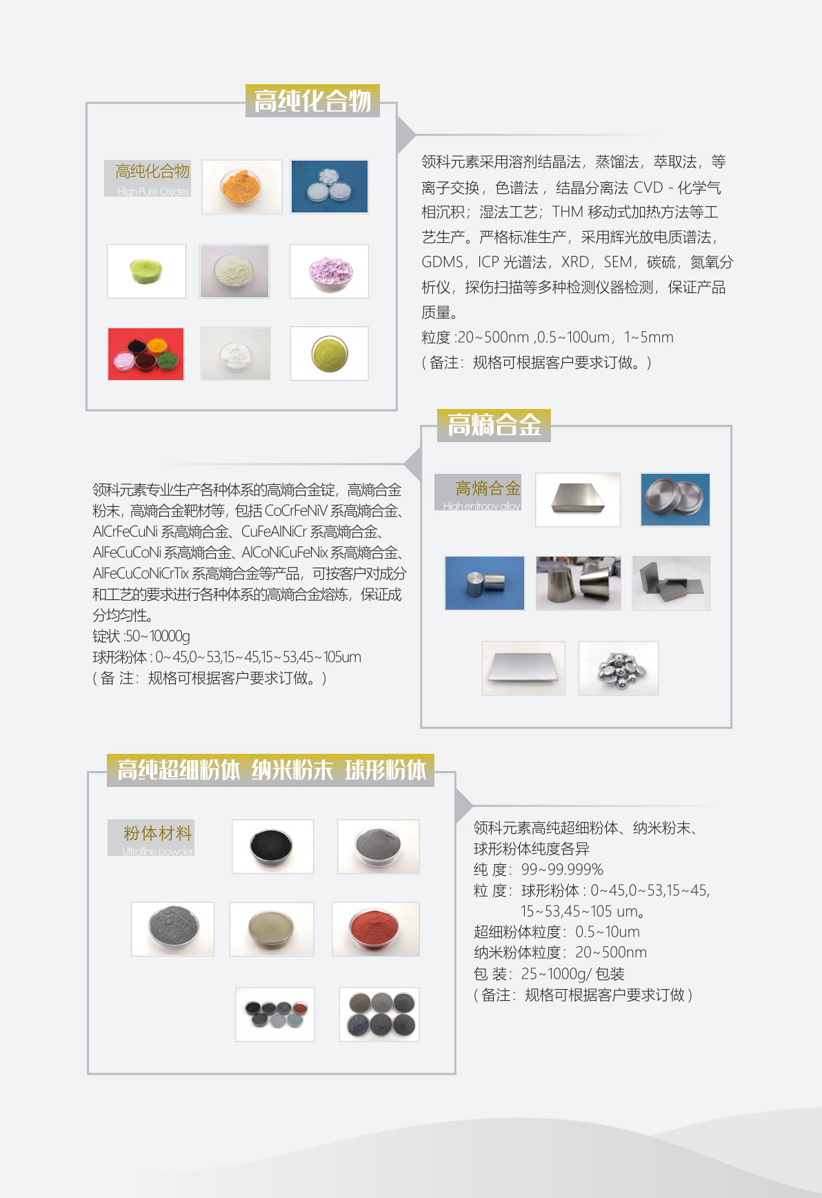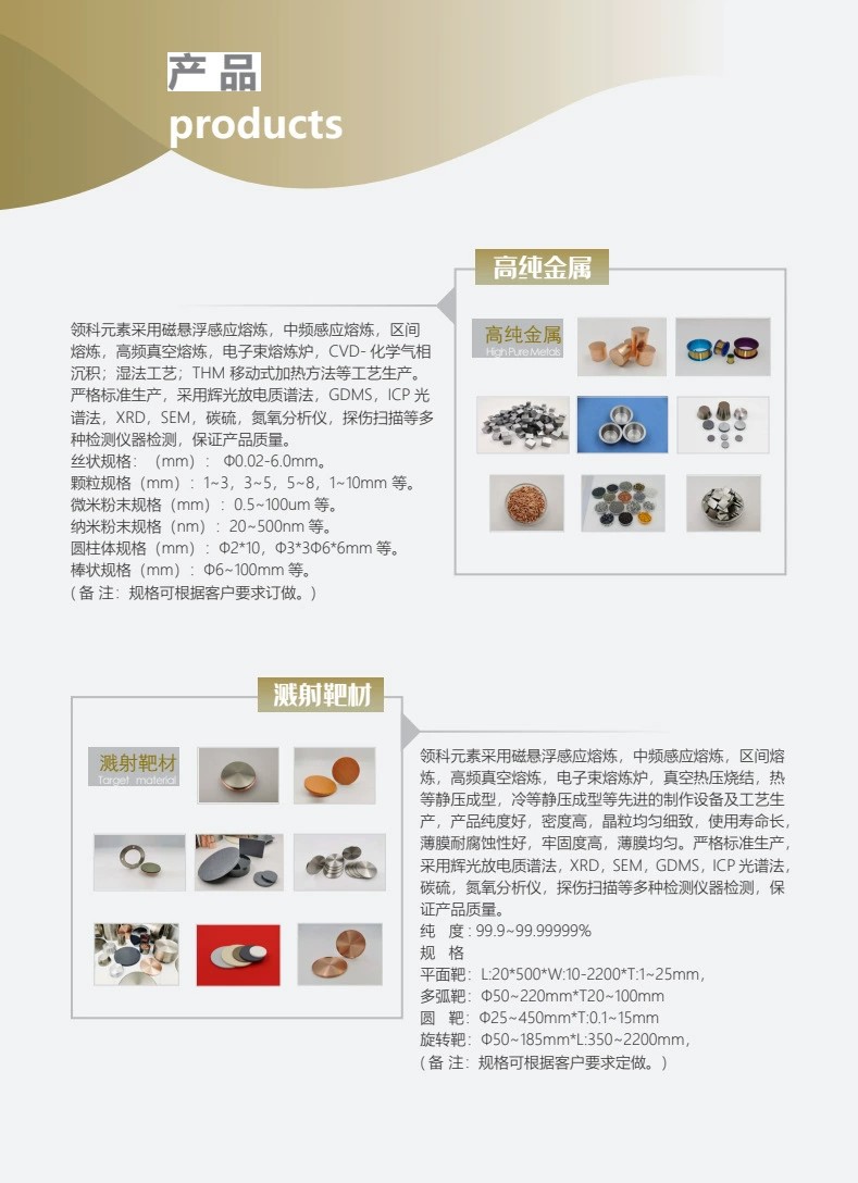 钨颗粒、钯靶材、铌靶材、铝靶材、硫化锑、钽颗粒、锑颗粒、硫化锌、铱颗粒、碲颗粒、银靶材、氧化铟、铜靶材、磷酸锂、硅靶材、钇颗粒、氧化钕、碲化锑、钛酸锶、锗颗粒、碳化硅、钛酸锂、钴靶材、氧化镁、石墨靶