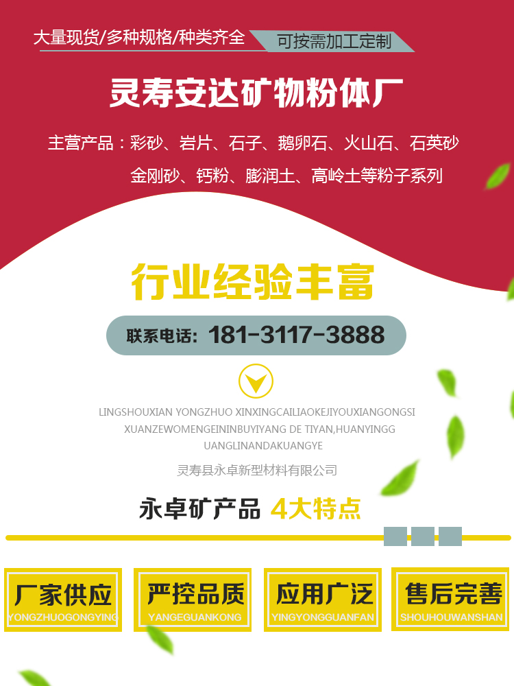 石英砂、金刚砂、金刚砂地坪材料、白云石、蛭石、云母、轻钙粉、重钙粉、重晶石粉、质感砂、鹅卵石、白沙子、火山石、方解石、高岭土、球场砂、草坪砂、石英砂滤料、滑石粉、膨润土、凹凸棒土、橡胶粉、陶土粉、麦饭石粉、石英粉