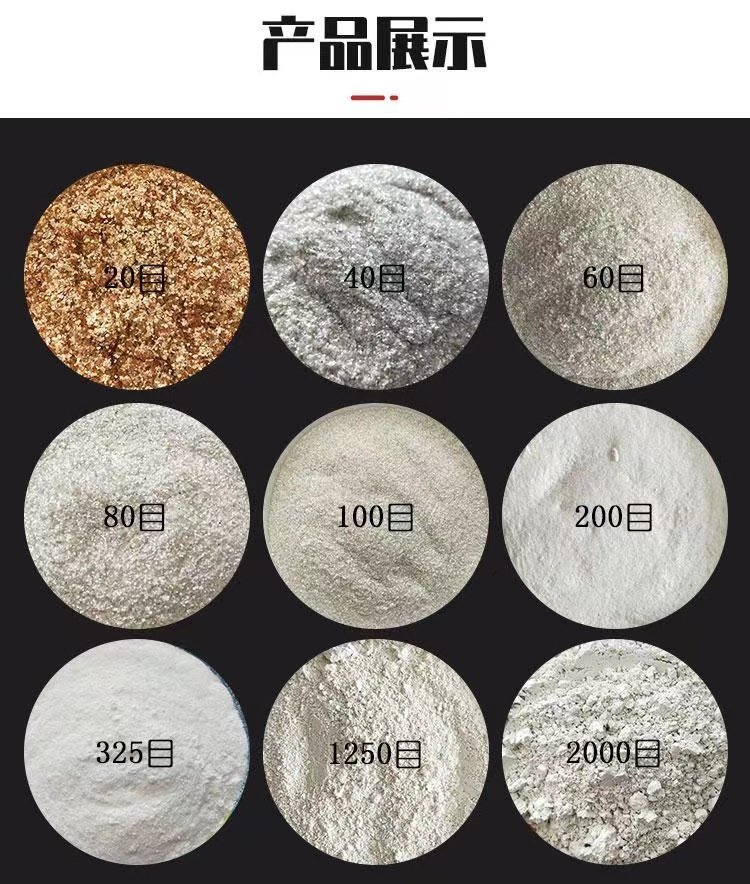 蛭石、云母、漂珠、硅藻土、膨润土、高岭土、防火涂料、萤石、石英砂、麦饭石、铝矾土、电气石、彩砂、鹅卵石、海泡石、钙粉、重晶石、木粉、钙粉