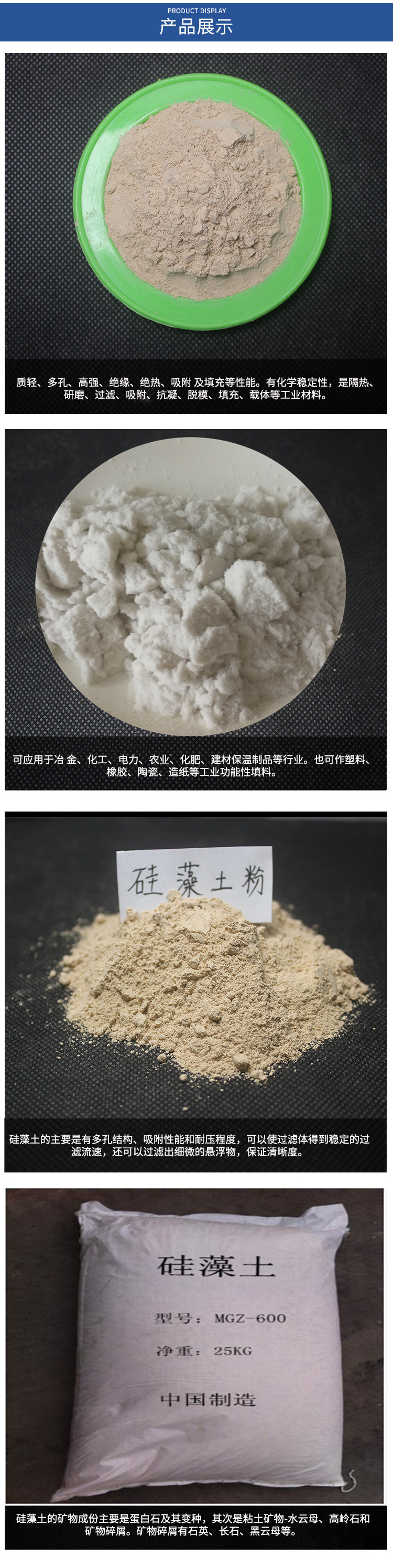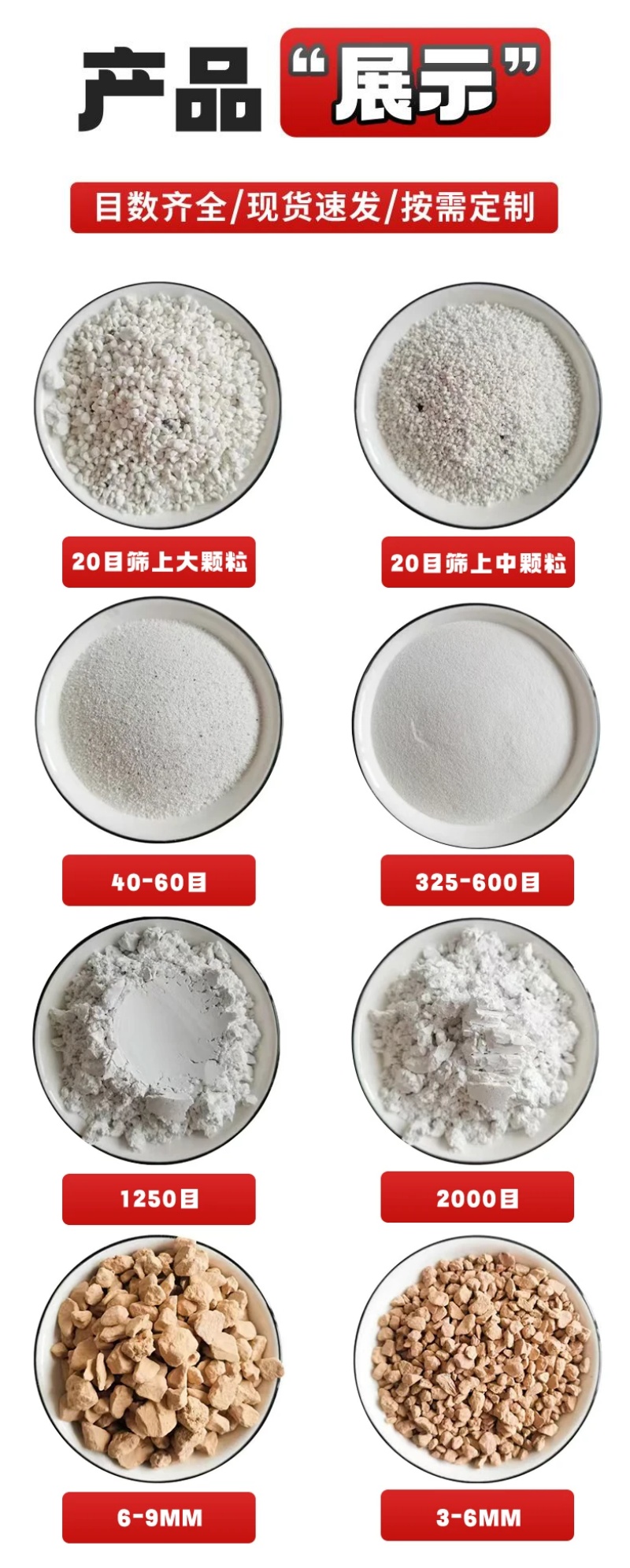 蛭石、云母、漂珠、硅藻土、膨润土、高岭土、防火涂料、萤石、石英砂、麦饭石、铝矾土、电气石、彩砂、鹅卵石、海泡石、钙粉、重晶石、木粉、钙粉