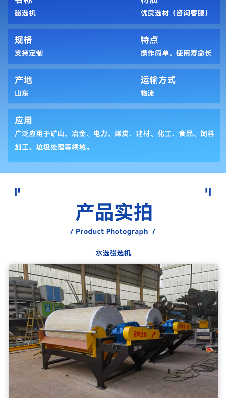干选滚筒、全磁滚筒、废钢磁选机、水选磁选机、永磁除铁器、悬挂式除铁器、铁矿磁选机、干选磁选机、强磁除铁器、湿式磁选机、石英砂长石强磁除铁机、电磁除铁器、皮带秤、定量皮带秤、配料皮带秤、吊挂皮带秤、自卸式除铁器、干式磁选机、强磁磁选机、立式磁选机