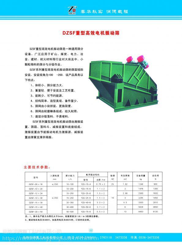 1. 山东潍坊临朐润德重工DZSF中性高效电机振动筛。用于矿山,煤炭,电力,冶金,建材,耐火材料等行业对大块及中小颗粒物料的筛分与分级作业。    1,体积小,筛分能力大2,重量轻,便于安装及工艺布置3,能耗小,节约资源4,结构简单,造型美观,备件量少5,筛网由小块拼装,更换简便6,筛网由 棒条组成,不易堵料。