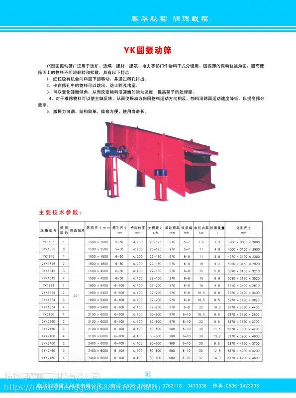.山东潍坊临朐润德重工YK圆振动筛。圆振筛的震动轨迹为圆,因而使筛面上的物料不断的翻转和松散,特点为1/细粒级有机会向料层下部移动,并通过筛孔派出。2/卡在筛孔中的物料可以跳出,防止筛孔堵塞。3/可以变化筛面倾角,改变物料沿筛面的运动速度,提高筛子处理量。4/对于难筛物料可以使主轴反转,使振动方向同物料运动方向像相反,提高筛分效率。5/激振力可调,结构简单,维修方便,使用寿命长。