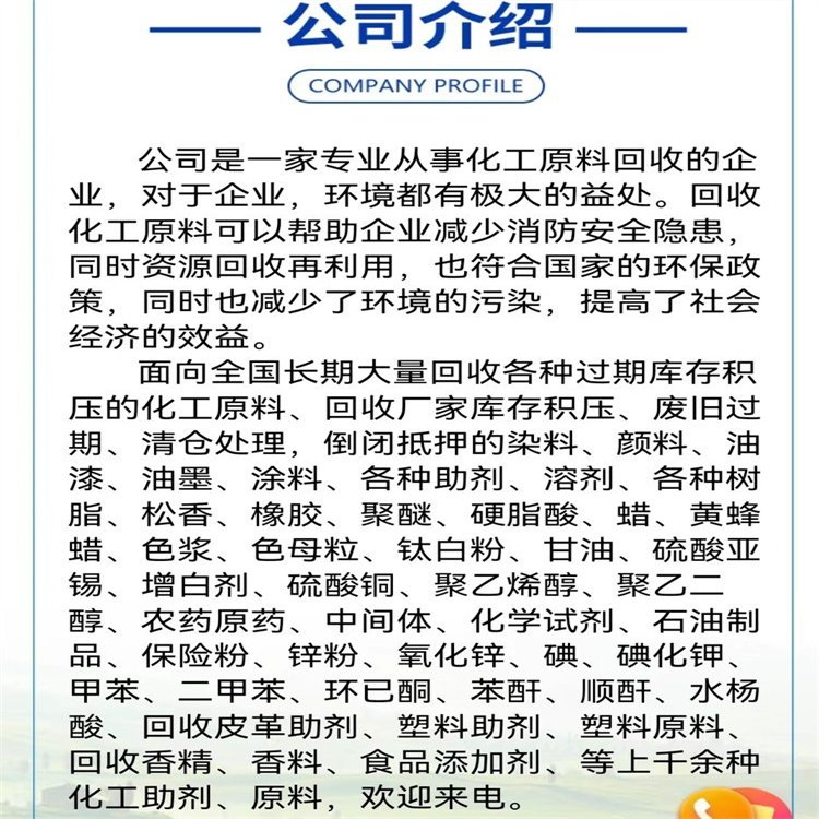 回收溶剂、回收油漆、回收色浆、回收染料、回收日化原料、回收油墨、回收颜料、回收橡胶助剂、回收塑料原料、回收食品添加剂、回收化工原料
