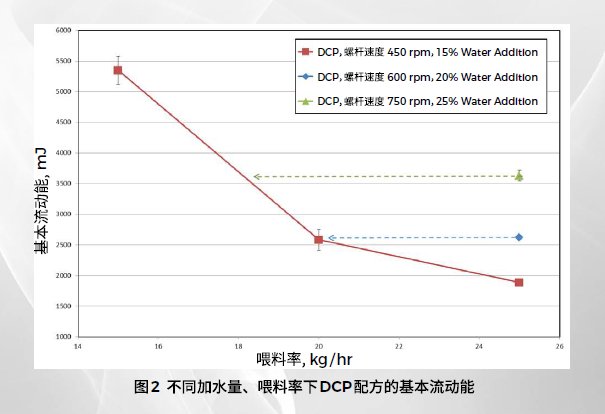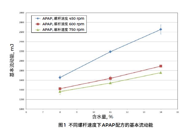 从 APAP 配方的数据图(图1)可以看出,在固定的给料速度下,对于所有的螺杆速度,基本流动能(BFE)随着水含量的升高而升高。