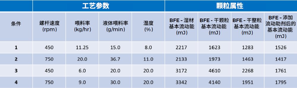 鉴于两种不同的基材都具备同样的规律,因此,能够认为使用不同的水含量、螺杆转速和供料速度等多个参数组合,获得指定的湿粒性质(用 BFE 数值描述)。