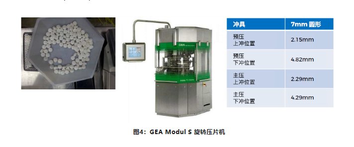 进一步使用 GEA Modul S 旋转压片机把 4 种不同条件下生产出的经湿粒、干燥、磨粉以及润滑后的最终颗粒进行压片,随后使用 Dr. Schleuniger Pharmatron 8M 压片硬度测试仪测试压片的强度(见图 4)。