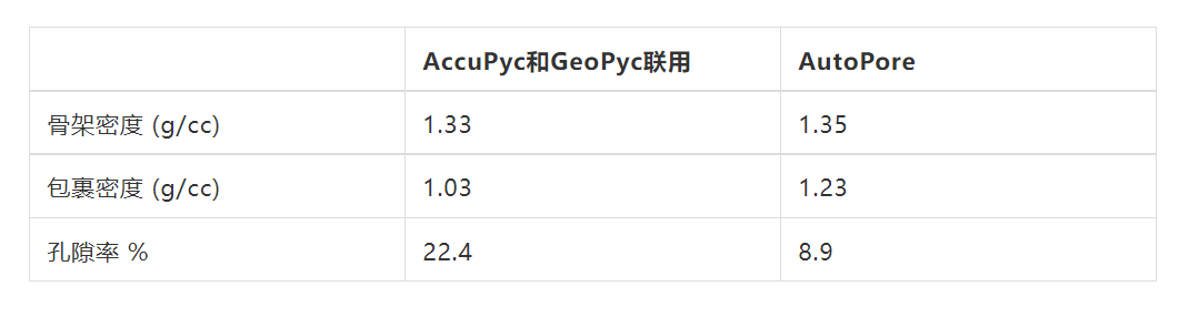 无论是气体置换或者压汞法,都能够进入片剂表面的孔隙,因此两种方法得到的骨架密度接近。由于GeoPyc包裹密度的测试中,包裹介质DryFlo的粒径远大于片剂的孔径,所以包裹密度值与AutoPore测得的值有差异。对于压汞法,即使没有施加压力,汞也能进入这些孔隙,因此包裹密度值较大。而包裹密度的差异,也得到了不同的孔隙率结果。