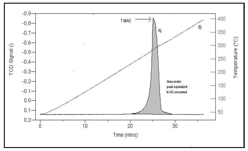 图1. 金属氧化物的TPR图。A曲线为TCD信号与时间的关系图,B曲线为以10 ℃/min的升温速率从室温升至400 ℃的温度与时间的关系图。