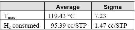 分别使用两台AutoChem化学吸附仪对上述氧化银进行总计36次TPR测试,所得的平均Tmax和H2消耗量统计结果如下表: