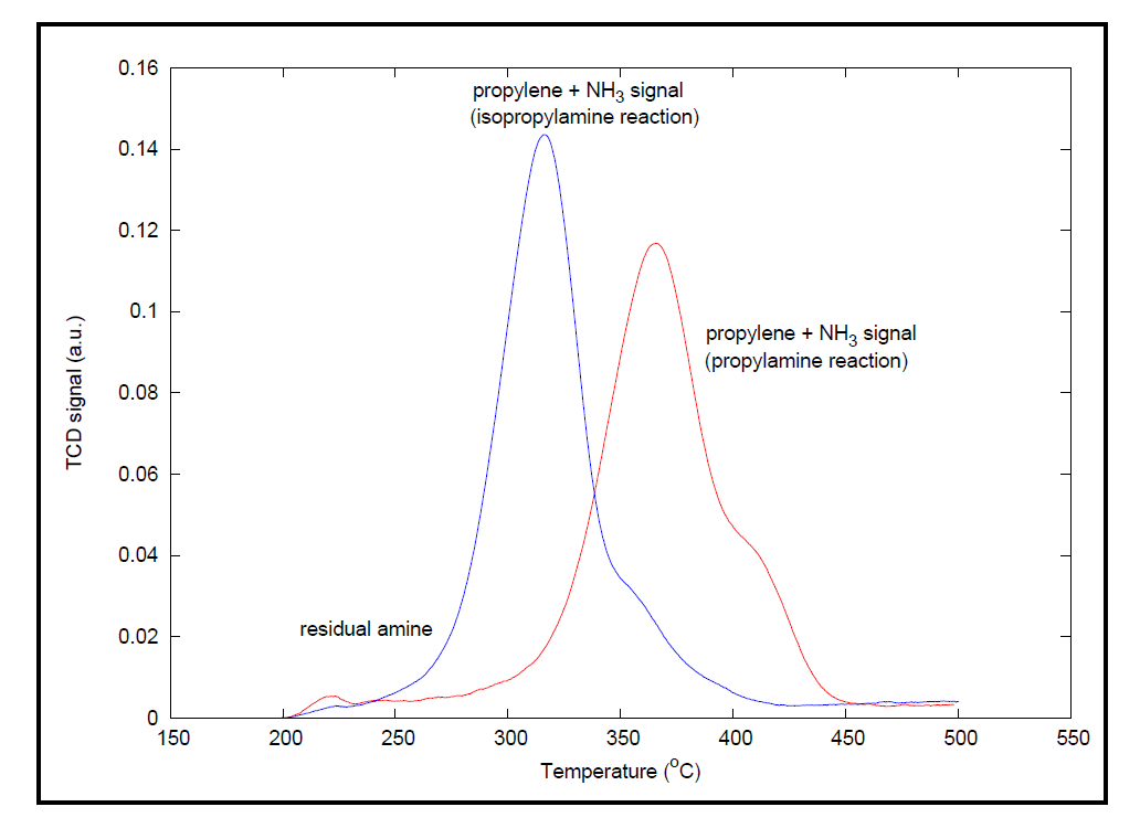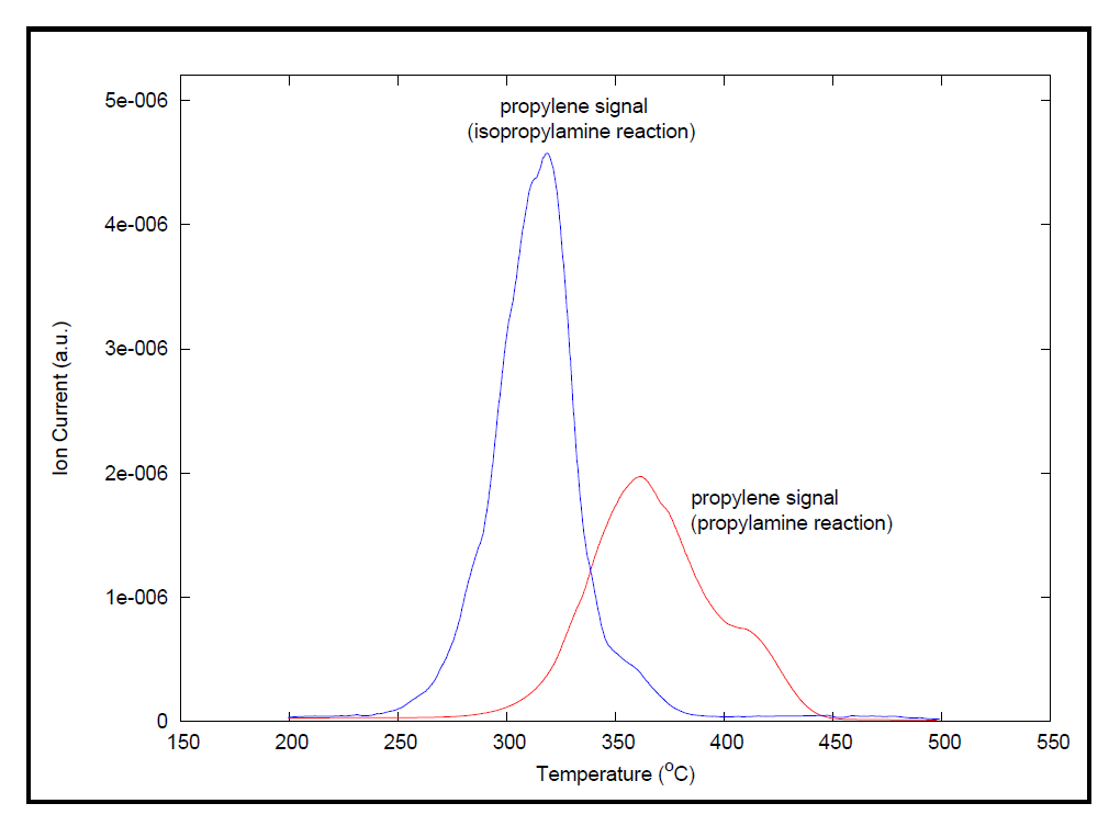 Y型分子筛活化后即进行脉冲化学吸附。在此步骤中,采用惰性气体氦气,通过流经一个5cm3的loop环向样品中注入10次丙胺蒸汽,以确保样品吸附饱和。分析的最后一步是程序升温脱附(TPD)。在这一步中,质谱仪开始扫描检测产物丙烯信号。数据是在200°C到500°C的程序升温期间采集得到。