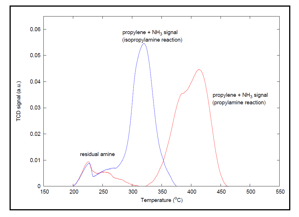 分子筛和其它催化剂的Brønstead酸度是影响反应动力学的重要因素。因此,这些酸位点的表征非常重要,通常参照氨化学吸附法测定催化剂酸度的标准试验方法(ASTM D 4824)进行。另一种表征方法则是使用丙胺对样品进行脉冲化学吸附,然后进行程序升温脱附(TPD)并连用质谱仪检测丙烯的方式进行分析(见图1)。采用带有蒸汽发生器的AutoChem化学吸附仪与质谱仪联用可以进行完整的表征分析。
