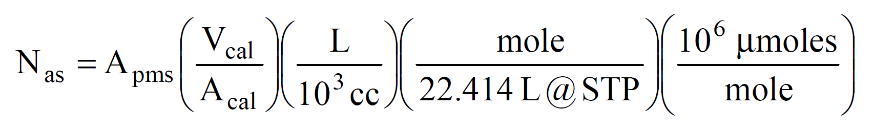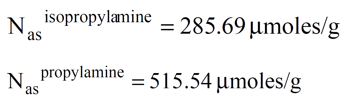 此外,图3和4表明,热导检测方法包括化学吸附中残留的胺和氨,而质谱仪检测则区分出丙烯信号,从而可以计算酸位点的浓度。通过对图4中丙烯信号积分得到峰面积(Apms)后,酸位点浓度Nas可计算如下: