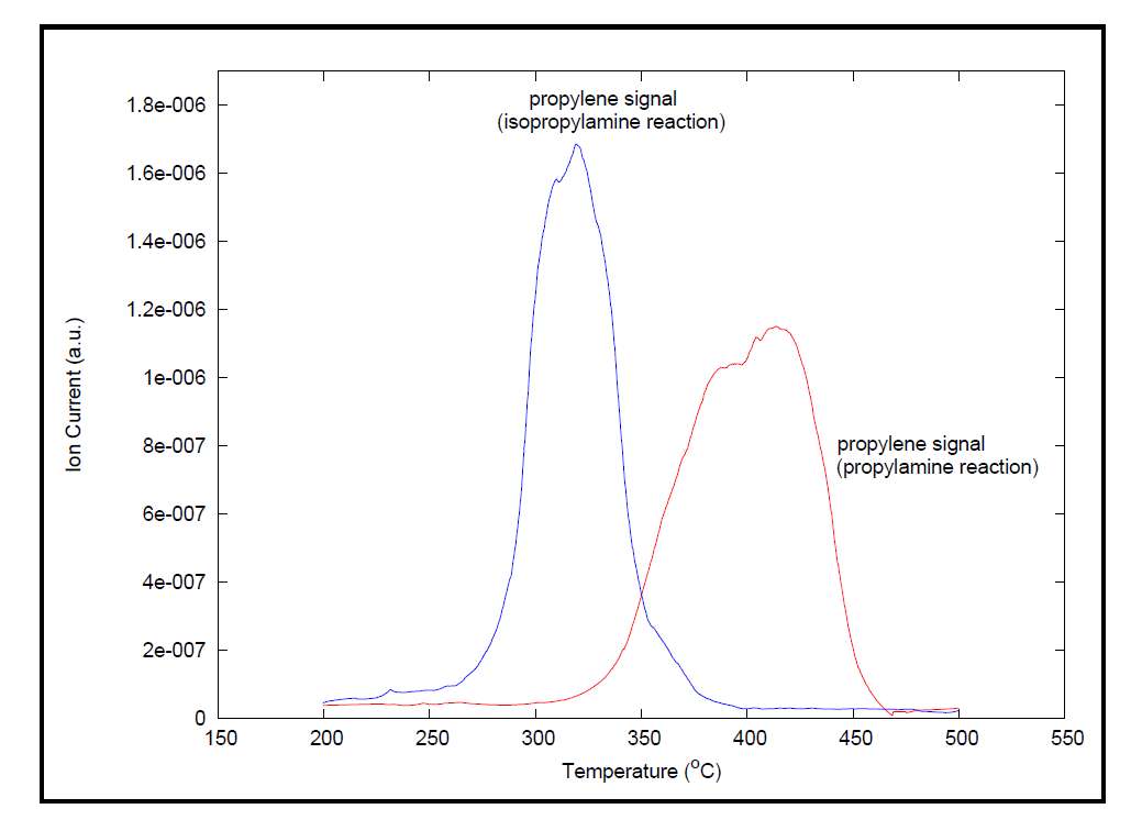 Beta分子筛活化后即进行脉冲化学吸附。在此步骤中,采用惰性气体氦气,通过流经一个5cm3的loop环向样品中注入10次丙胺蒸汽,以确保样品吸附饱和。分析的最后一步是程序升温脱附(TPD)。在这一步中,质谱仪开始扫描检测产物丙烯信号。数据是在200°C到500°C的程序升温期间采集得到。