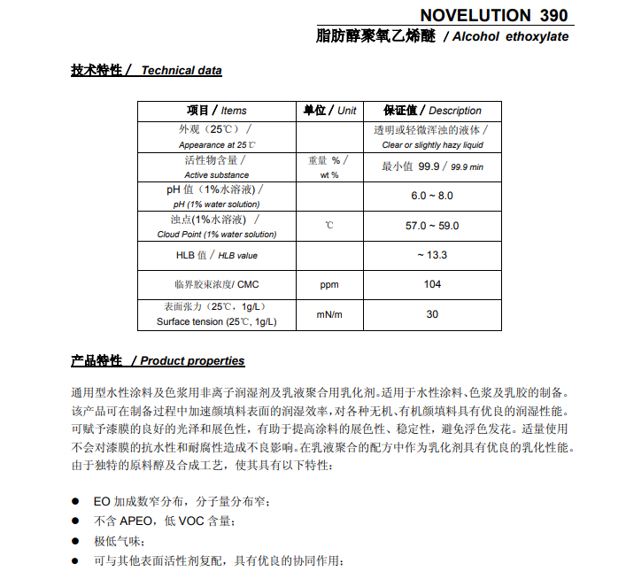 沙索水性涂料色浆非离子润湿剂乳液聚合用乳化剂NOVELUTION 390