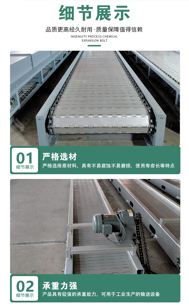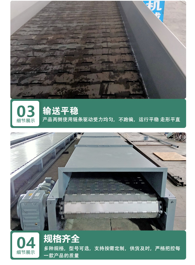 输送线、输送带、提升机、平顶链、加厚链板、重型链板、链板输送机、链板给料机、链板提升机、打包机链板、破机链板、窑炉链板、窑炉网带、退火炉网带、马蹄链、转弯机、烘干机、不锈钢网带、退火炉网带、垃圾输送链板、网带输送机、网带提升机、不锈钢网链、输送网链、输送链板