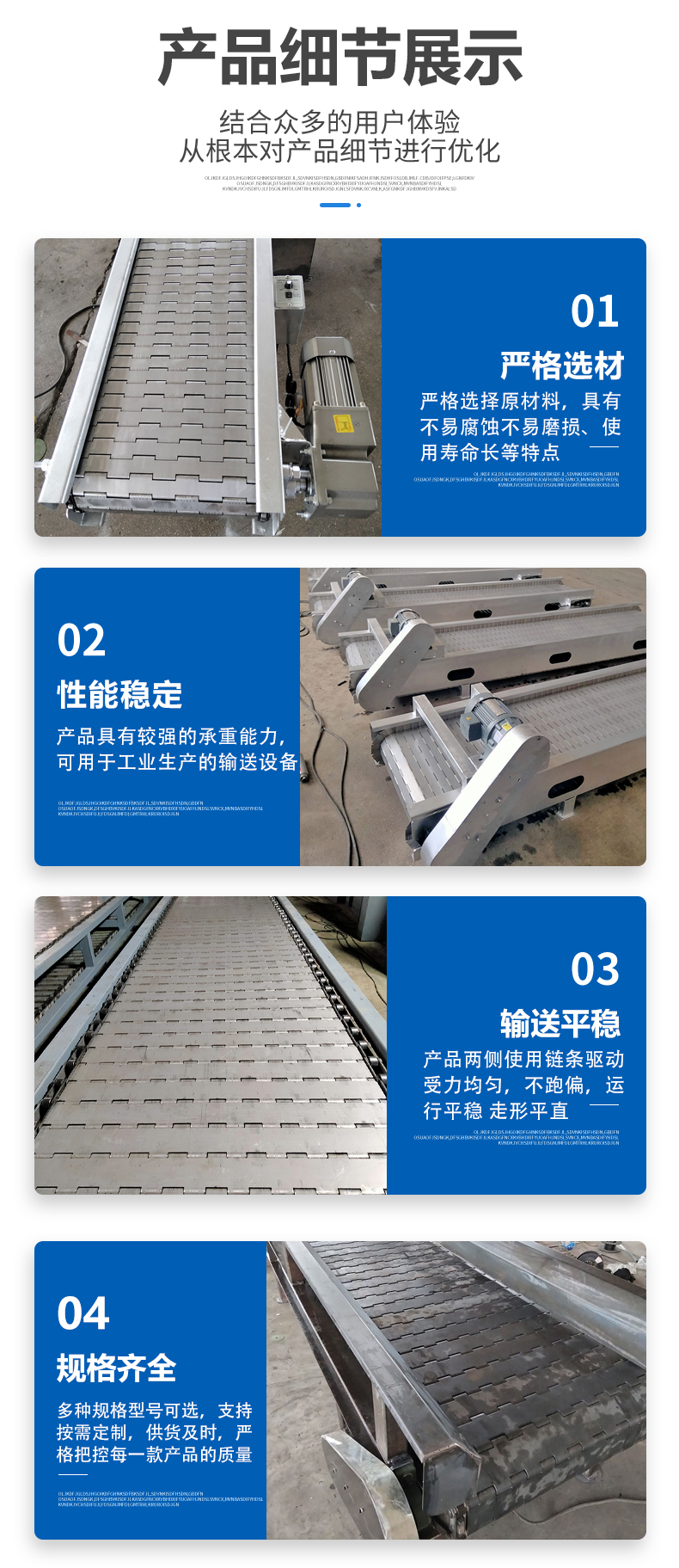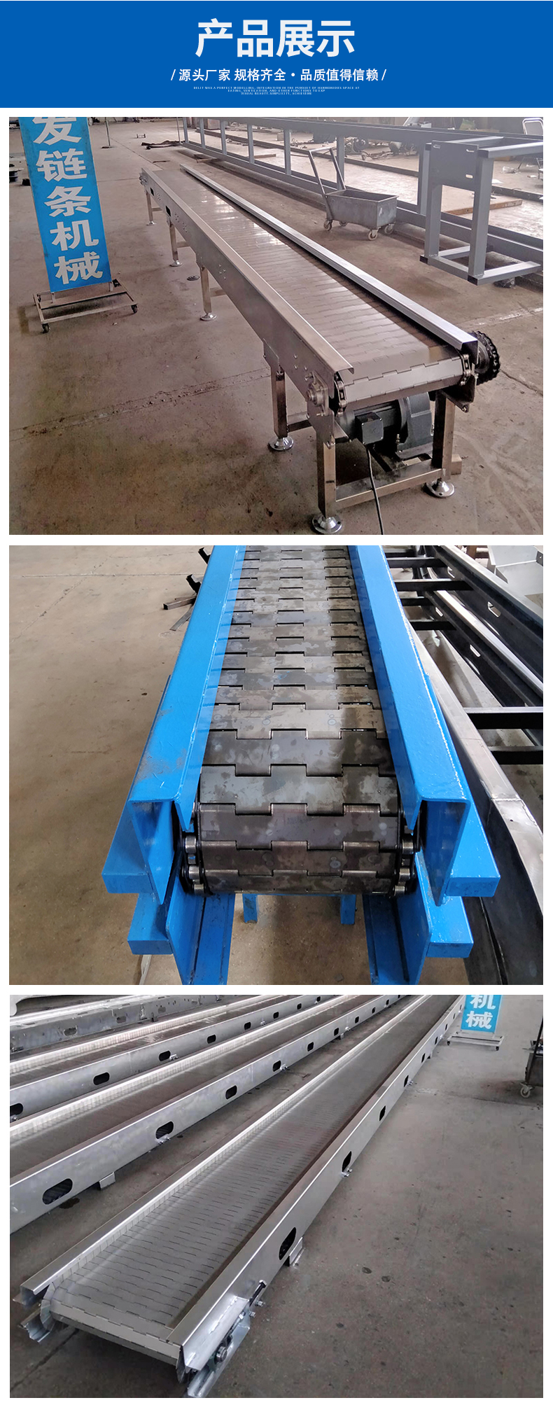 输送线、输送带、提升机、平顶链、加厚链板、重型链板、链板输送机、链板给料机、链板提升机、打包机链板、破机链板、窑炉链板、窑炉网带、退火炉网带、马蹄链、转弯机、烘干机、不锈钢网带、退火炉网带、垃圾输送链板、网带输送机、网带提升机、不锈钢网链、输送网链、输送链板