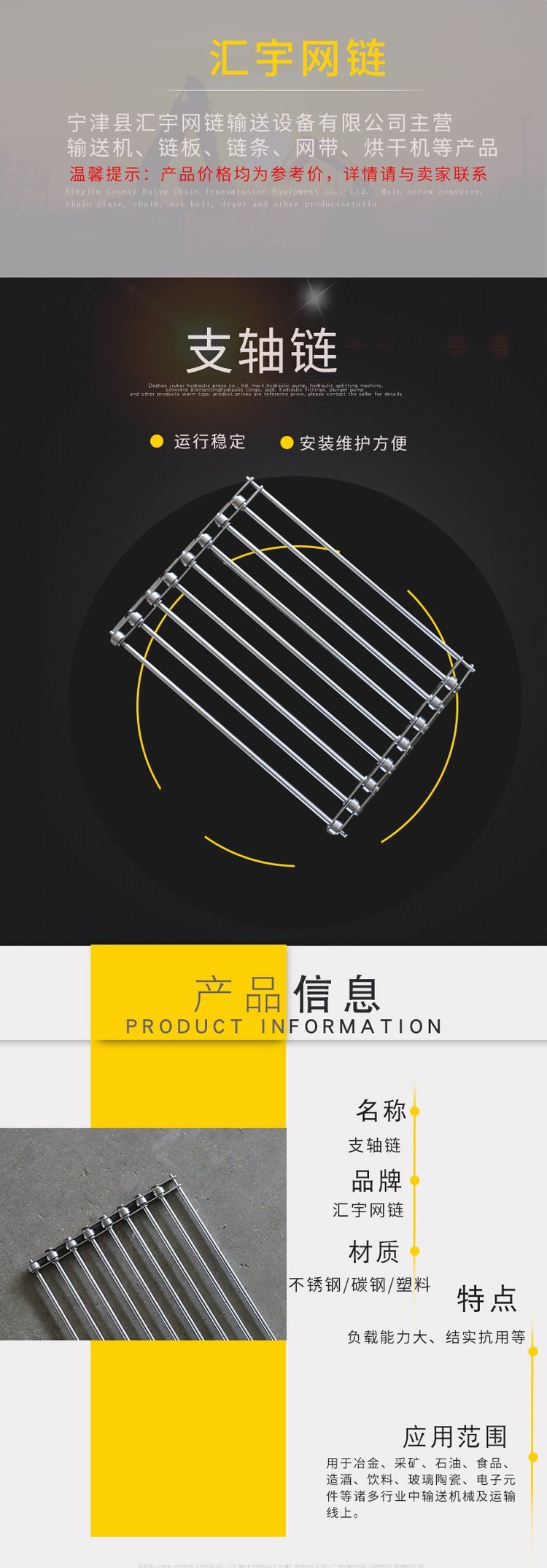 宁津县汇宇网链输送设备有限公司是一家集生产,研究开发网带,链板,链条,输送机械的企业。公司集模具开发、制作、生产、销售等一条龙型生产。产品以具有承载力大,输送量强,使用寿命长等特点。