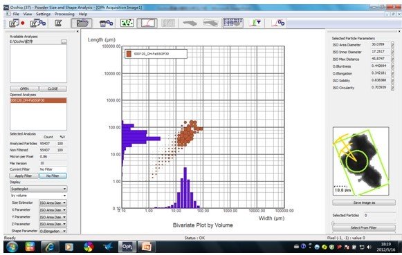 散点图:可以得到粒径参数对粒形数据的分布图。根据操作者所选的粒径分级,所有的图都和颗粒一致,操作者也可以在图中点击让所点颗粒可视化。