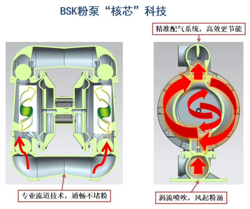 粉体输送专用隔膜泵是用来输送固体粉末状物料的,与输送液体的隔膜泵还是有较大的区别。固体粉末状物料只有在保持半流动状态下,才不至于在泵腔体内被压缩成近似固体的块状导致输送失败和损坏泵。因此,用于输送液体的普涌双隔腹泵是无法正常用于固体干粉输送的。粉体输送专用隔膜泵系统需堆加一组特殊的阀,在每个泵循环中,根据一定的时间顺序,将压缩空气同引入泵的腔体,使在粉体的泵送过程中保持流动状态。流化气体和泵的马达驱动气体可以分离,避免物料空气接触氧化和潮解,流化气(与粉体接触)可单独作进一步净化干噪处理。