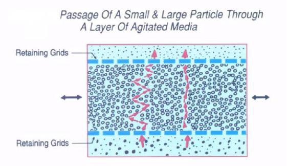 At this rapid speed, the premixed slurry is pumped through a confined media bed. The media act