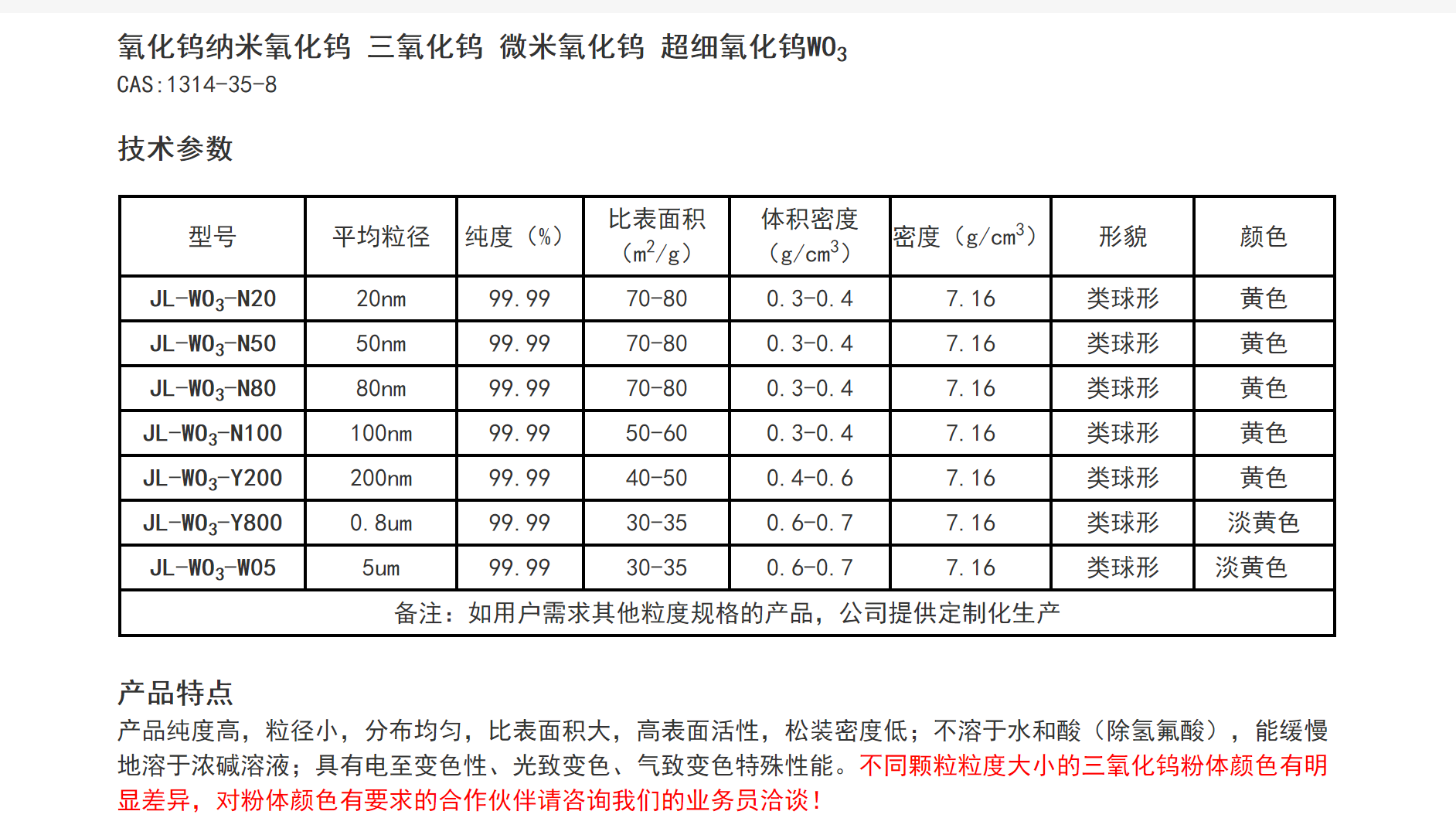 纳米三氧化钨粉 超细 高纯 氧化钨粉末 WO3 99.99% 厂家 陶瓷器的着色剂