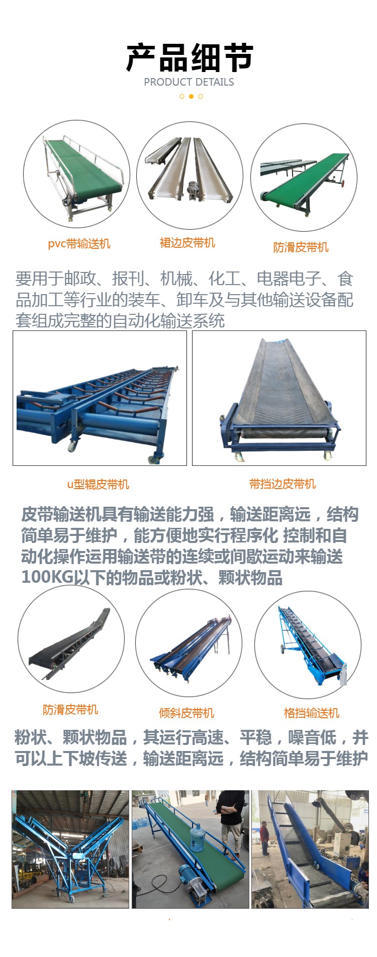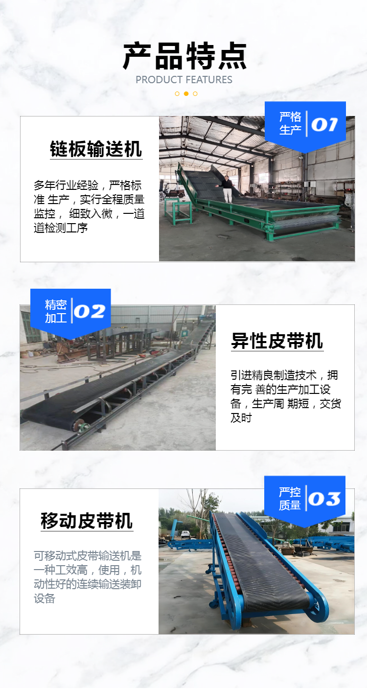 移动式皮带机、电动升降输送机、物流分拣输送机、螺旋输送机、粮食提升机、不锈钢上料机、绞龙上料机、车载软管吸料机、可弯曲抽料机、垂直斗提机、单斗提升机、刮板输送机、双链条刮板机