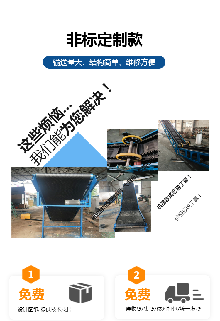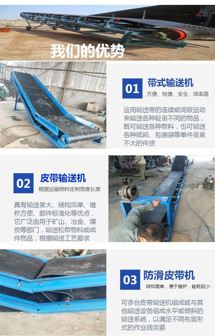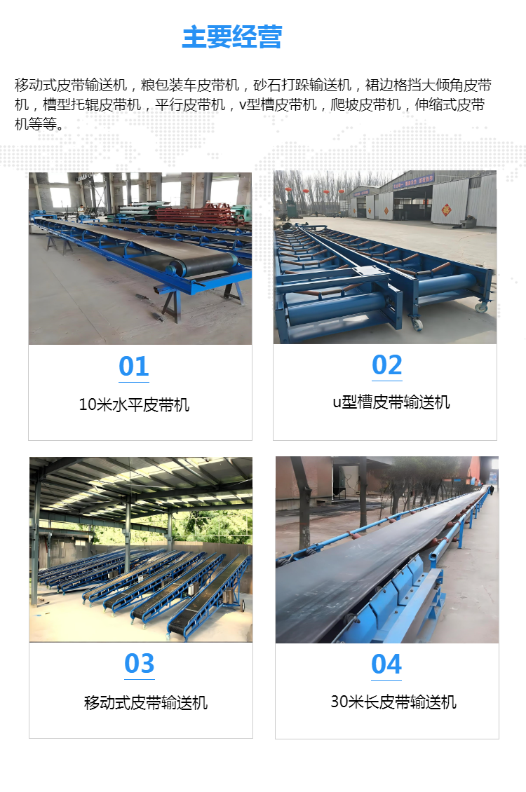 移动式皮带机、电动升降输送机、物流分拣输送机、螺旋输送机、粮食提升机、不锈钢上料机、绞龙上料机、车载软管吸料机、可弯曲抽料机、垂直斗提机、单斗提升机、刮板输送机、双链条刮板机