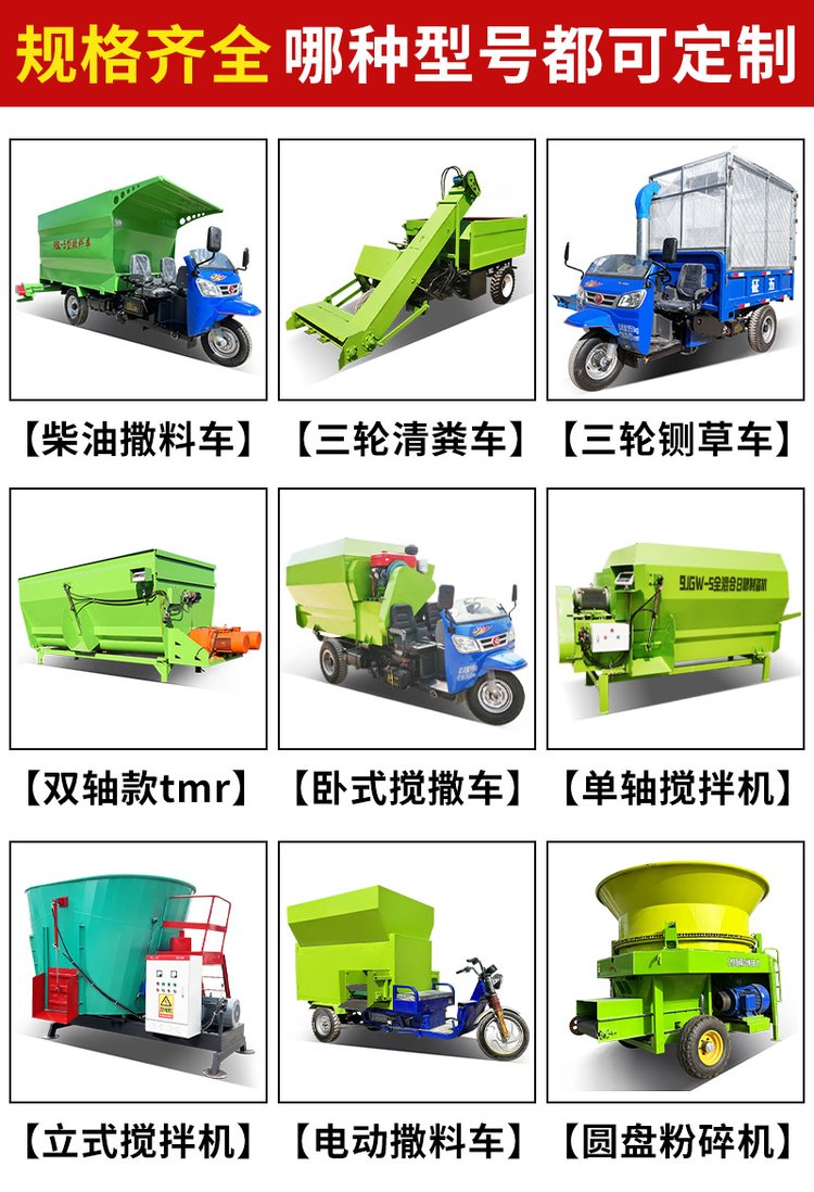 喂牛车、搅草机、清理车、投料车、抽粮泵、混合机、粉机、分离机、饲料机、喂料车、饲喂车、上粮机、提粮泵、混草机、清粪车、青贮取料机、撒料车、饲料搅拌机、牛羊喂料车、柴油清粪车、粪便处理机、投料车、拌料机、全日粮制备机