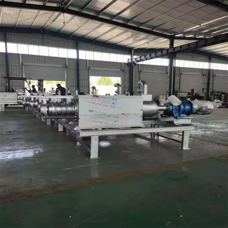 螺旋式挤压固液分离机,采用螺旋式挤压工作方式,将处理物中的水分挤压分滤出来,绞龙,滤网为合金钢制造。绞龙受力部位采用合金处理技术。滤网分滤效率好,不易堵塞,易冲洗。该机可根据固态物质的不同要求,自由调节干湿度。