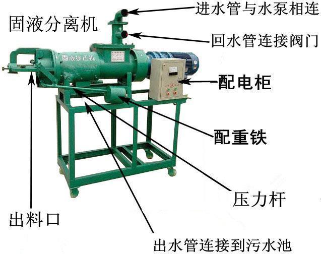 用液下泵将原粪水提升送至猪粪脱水机内,挤压绞龙将沼渣沼液逐渐推向机体前方,同时不断提高前缘的压力,迫使物料中的水分在边压带滤的作用下挤出网筛,流出排水管。粪便脱水机的工作是连续的,其物料不断的提升至机体内,前缘的压力不断增大,当大到一定程度时,就将卸料口顶开,挤出挤压口,达到挤压出料的目的。如果抽入的粪便水过多也会经溢管排到原粪池中也起到了搅拌的作用,经螺旋挤压过滤分离出的废水可直接派送至沉淀池等。为了掌握出料的速度与含水量,可以调节主机下方的配重块,以达到满意适当的含水率。