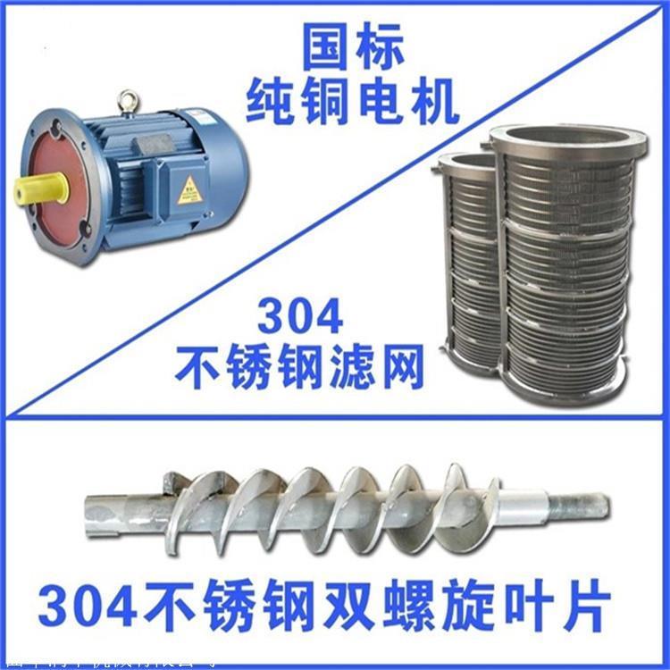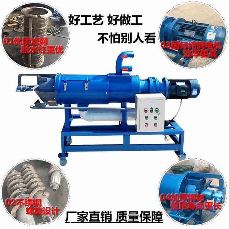 畜禽粪便处理机具有体积小、转速低、操作简单、安装、维修方便、费用省、效率高、投资回收快,不需添加任何絮凝剂等特点;畜禽粪便处理机采用的高强度螺旋轴、耐腐合金双螺旋叶片、筛网为不锈钢制作,螺旋叶片采用合金处理,使整机的使用寿命更长是其他厂家的2倍。