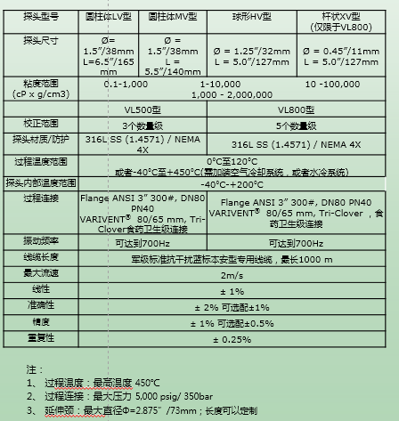 VL800:测量范围为:0.1 to 2,000,000 cP / mPa﹒s, 即使在温度高达450C,压力5,000 psi /350bar 的条件下,VL 800仍旧是非常可靠的在线粘度仪。