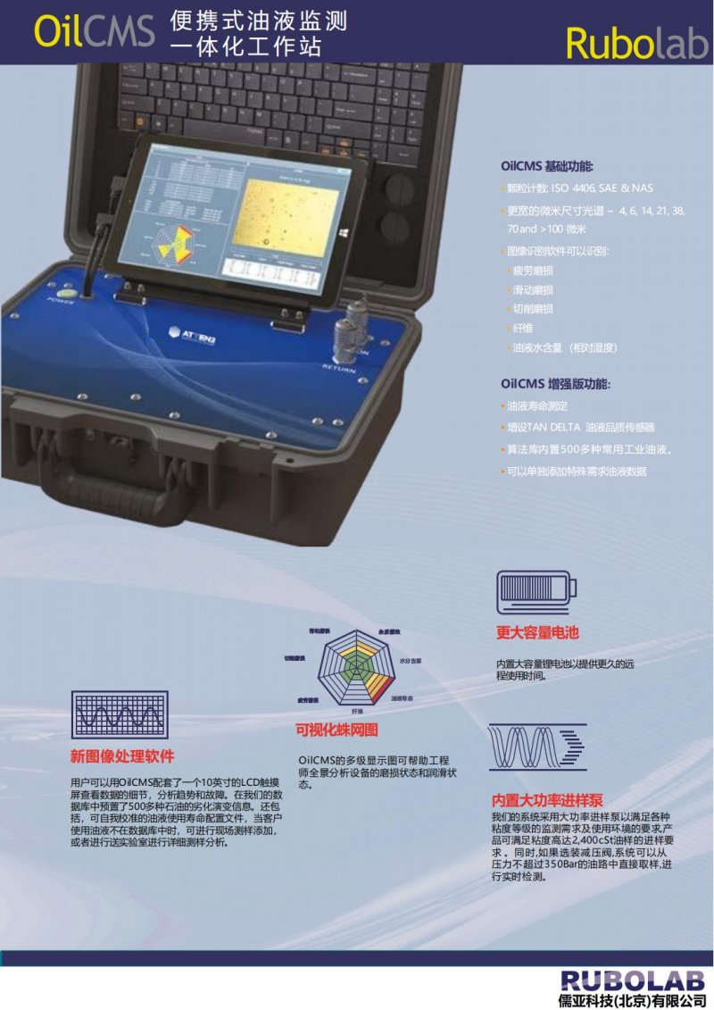 OIilCMS 系列便携式油液综合监测系统采用字成像智能铁谱技术,全面监测油液中的固体污染颗粒总数及尺寸分布,并对机械磨颗粒按照 疲劳磨损、滑动磨损及切削磨损进行智能分类,也能有效消除油液中的气泡及 滴对检测结果造成的影响;同时,内置油液使用寿命及水分检测传感器,面监 测设备的磨损状态及其润滑状态OilCMS_00.png