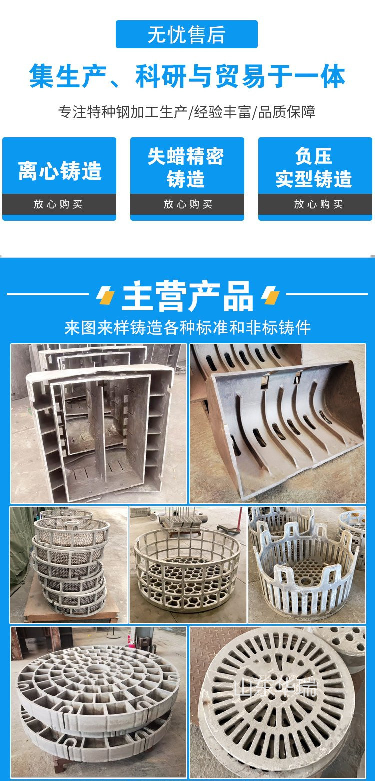 稀土合金耐磨管、耐热钢铸造、耐磨钢铸件、热处理工装、耐高温炉低板、翠火料筐、真空炉料盘、高铬衬板、离心铸管、锅炉配件、流化床风帽、耐热钢抓斗、煤粉喷口、不锈钢铸件、步进梁、无缝钢管、镍合金钢板、下料管、耐热钢垫块、不锈钢滑块、灰铁铸件