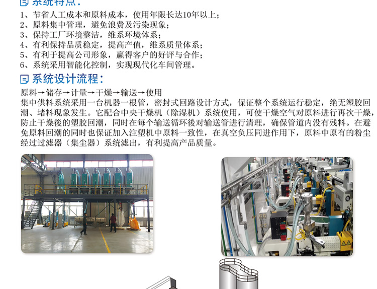 集中供料系统特点: 1、节省人工成本和原料成本,使用年限长达10年以上; 2、原料集中管理,避免浪费及污染现象; 3、保持工厂环境整洁,维系环境体系; 4、有利保持品质稳定,提高产值,维系质量体系; 5、有利於提高公司形象,赢得客户好评与合作。