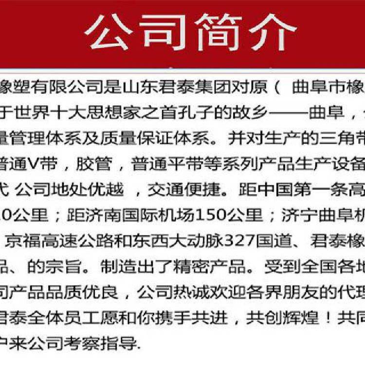 山东君泰橡塑有限公司专 业生产食品机皮带 食堂切菜机皮带、家用压菜机皮带等马铃薯、蕃薯、瓜类、竹笋、洋葱、茄子以及叶菜类蔬菜:芹菜、大白菜、卷心菜、菠菜等蔬果类切成丁、片、丝条状。适合工厂、学校饭堂、食品厂等机器使用皮带使用。