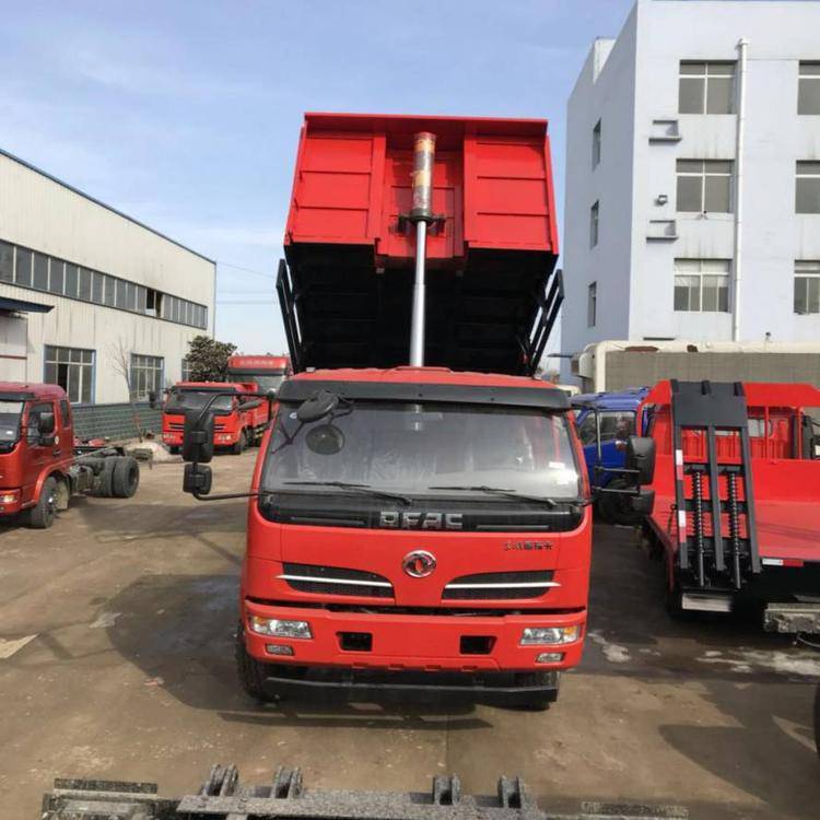 自卸货车的车厢分后向倾翻和侧向倾翻两种,通过操纵系统控制活塞杆运动,后向倾翻较普遍,推动活塞杆使车厢倾翻,少数双向倾翻。