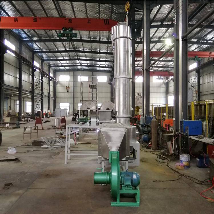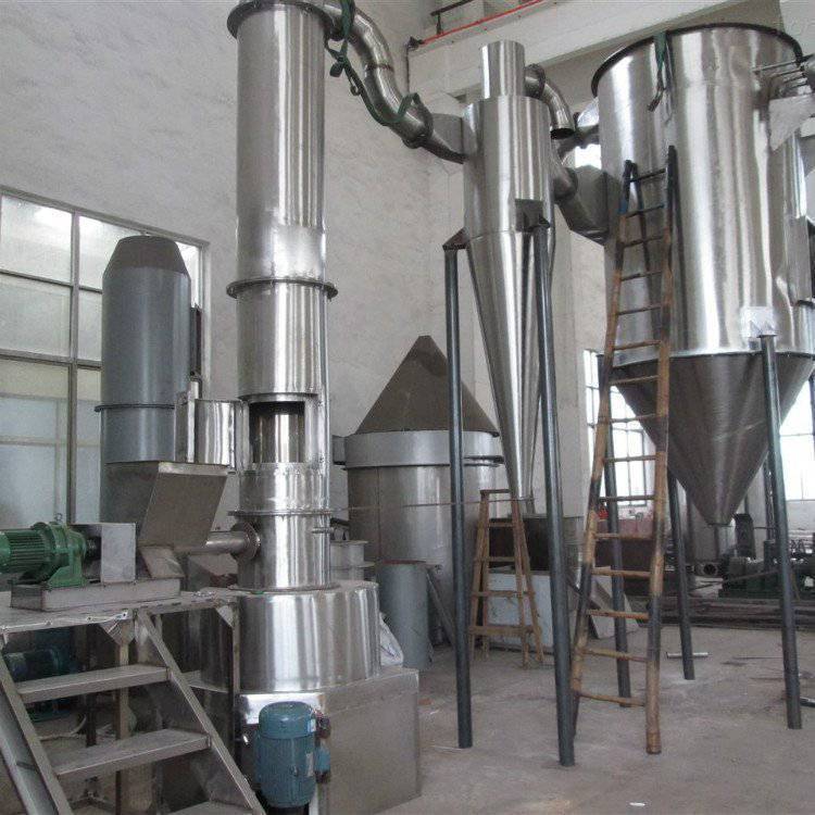 热空气由入口管以适宜的喷动速度从干燥机底部进入搅拌粉干燥室,对物料产生强烈的剪切、吹浮、旋转作用,于是物料受到离心、剪切、碰撞、摩擦而被除数微粒化,强化了传质传热。在干燥机底部,较大较湿的颗粒团在搅拌器的作用下被机械破,湿含量较低、颗粒度较小的颗粒被旋转气流夹带上升,在上升过程中进一步干燥。由于气固两相作旋转流动,固相惯性大于气相,固气两相间的相对速度较大,强化两相间的传质传热
