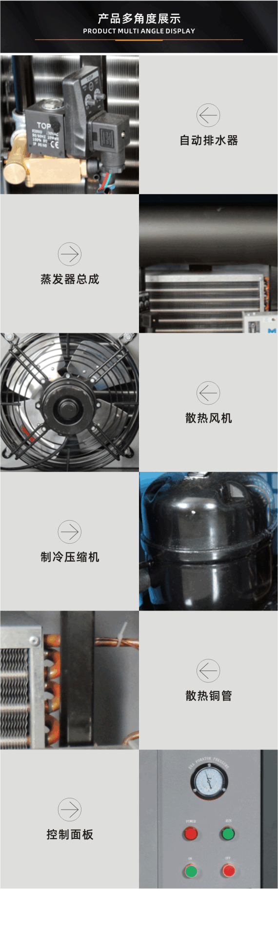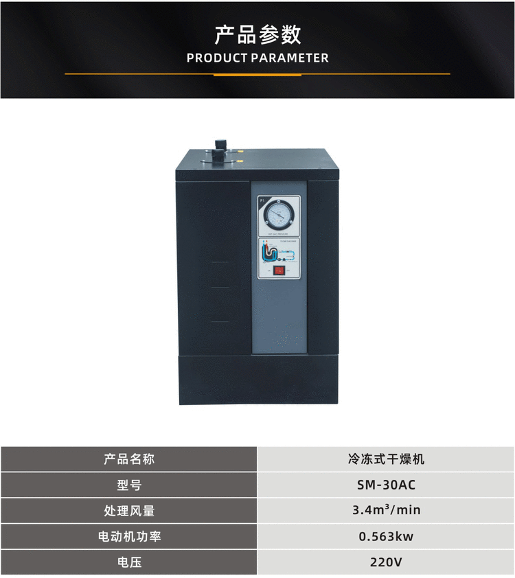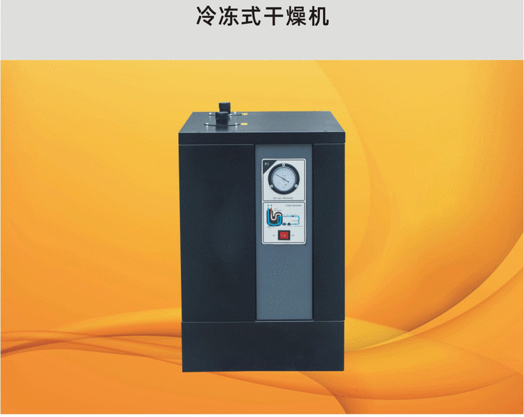 性能特点:冷冻式干燥机是根据冷冻除湿原理,将压缩空气强制通过蒸发器进行热交换而降温,使压缩空气中气态的水和油经过等压冷却,凝结成液态的水和油,并夹带尘埃,通过自动排水器排出机外,从而获得清洁的压缩空气的一种机器。1.功率:0.563kw 2.处理风量:3.4m3/min 3.排气压力:0.8Mpa 4.电源:220V/50Hz 5.尺寸(L×W×H)mm:800×440×800
