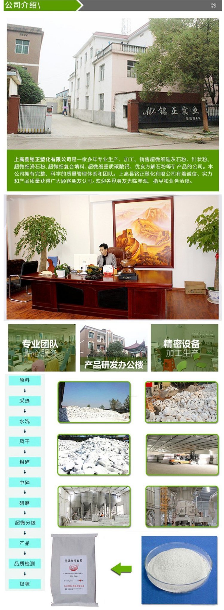 透明粉、硅灰石粉、油漆涂料、微细玻璃粉、油墨填料、轻质碳酸钙、高纯填充料、超白碳酸钙、超微细油墨、颜料填充料、消光碳酸钙粉、重质碳酸钙粉、优良白云石粉、超微细滑石粉、玻璃粉、滑石粉