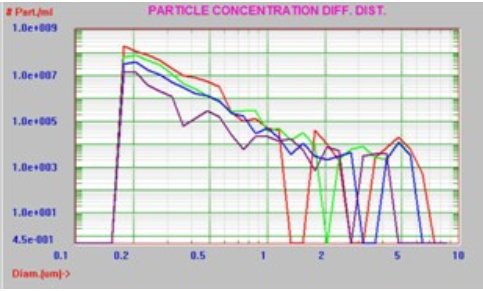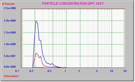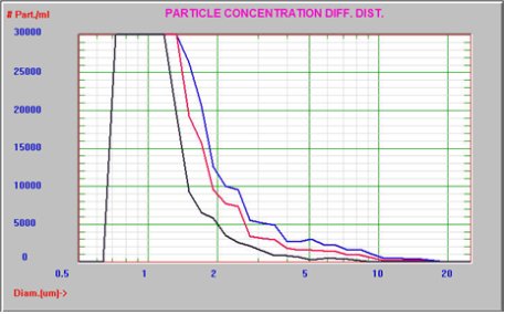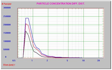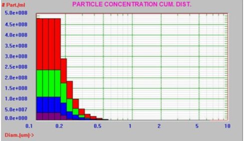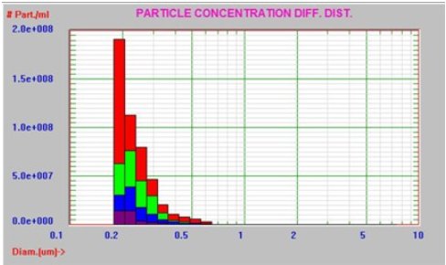 蛋白质样品然后通过0.2µm再次过滤后,使用AccuSizer FX-Nano系统分析。过滤前后的对比结果如图3所示。PBS的结果也显示为黑色。过滤后的浓度从9.7×108颗/mL降低到3.1×108颗/mL。AccuSizer FX-Nano系统可以清楚地看到聚集颗粒尾巴的减少,并且可以轻松识别。