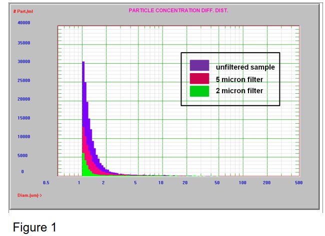 图1显示了用2微米和5微米过滤器过滤喷墨墨水的过滤测试结果。两种过滤器都显示出>1微米颗粒浓度的改善。未经过滤的样品中含有大于1微米的10万个颗粒/毫升,而5微米和2微米的样品中分别含有约7万个和约2万个颗粒/毫升。AccuSizer 780能够有效地检测超大尺寸颗粒的数量。AccuSizer也可作为监测质量控制过程有效性的分析工具。