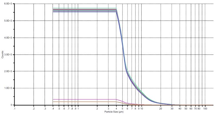 提供颗粒浓度和ISO 4406等级编号的自动报告将打印或发送到LIMS系统。生成报告的示例如图5和6所示。图5显示了针对单个样品管进行三次测量的标准ISO 4406报告。图6中的数据显示了将一个样品分为四个样品管的颗粒数与尺寸数据的关系,每个样品管分析了三次。下方的两条曲线显示了瓶之间清理后的背景计数。