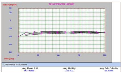 在另一项研究中,建立了Zr-89标记脂质体,以评价长循环脂质体在一周内的药代动力学。 放射性被隔离在亲水性内腔、脂质双层或脂质体表面。 本研究中的脂质体是在Nicomp 380 N3000 激光粒度仪上测量的,其尺寸分布范围为114-120nm。 用相位分析光散射模式(PALS)在Nicomp上测量了Zeta电位。 测量设置包括在电极之间的0.4厘米间隙施加12V/cm电场,并使用Smoluchowski极限。 多个测量结果如图14所示。