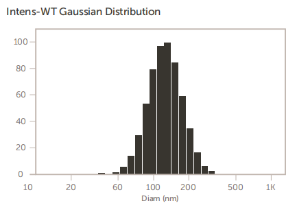 在研发制造过程中,如通过滤膜挤压,Nicomp 380 N3000激光粒度仪 和AccuSizer 780 A2000 SIS颗粒计数器都被用来精确地检测脂质体的粒径。第一组结果,如图4至图6所示,脂质体通过小尺寸的过滤器挤出后Nicomp 380 N3000激光粒度仪的粒径检测结果。